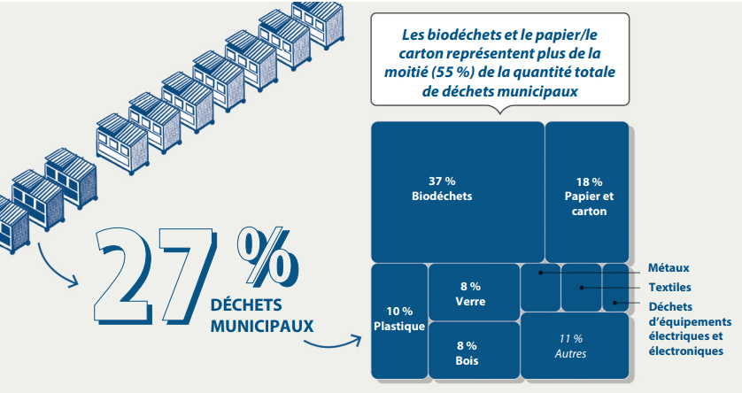 Chaque personne en France a produit en moyenne 530 kg de déchets en 2023. Les déchets municipaux en font partie. Principalement composés de matériaux d’emballage et de « biodéchets » (déchets alimentaires et déchets biodégradables), les déchets ménagers nécessitent une collecte séparée bien organisée, ainsi que des infrastructures adaptées pour le tri. L’implication citoyenne comme celle des entreprises françaises semblent manquer. En effet, la Commission européenne inclut la France dans la liste des 18 pays de l’UE susceptibles de ne pas atteindre l’objectif de 55 % de recyclage des déchets municipaux d’ici 2025, et dans la liste des 19 pays de l’UE susceptibles de ne pas atteindre l’objectif spécifique de 50 % pour le plastique d’ici 2025. Globalement, la France incinère ou enfouit encore plus de déchets qu’elle n’en recycle ou n’en composte.