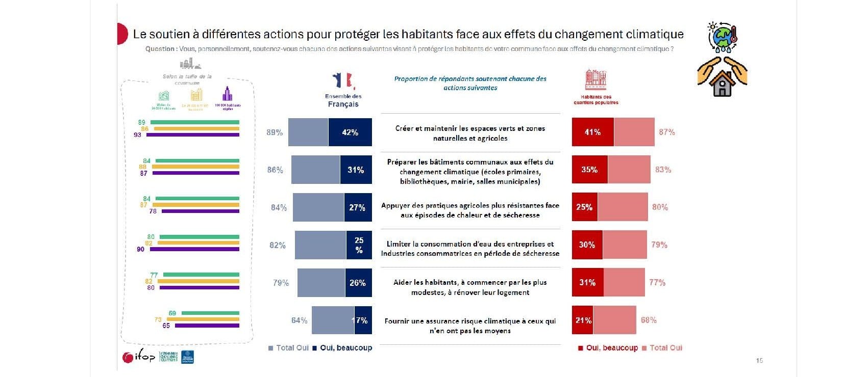 Le sondage met en avant quelques mesures écologiques municipales qui rencontrent un plébiscite. Ainsi, comme le rapporte le RAC : « 89 % [des répondants] approuvent la création d’espaces verts et la protection des zones naturelles et agricoles, 86 % la préparation des bâtiments communaux aux effets du changement climatique. 85 % [sont] pour développer l’offre de transports en commun accessibles à tous, le covoiturage et l’autopartage ».