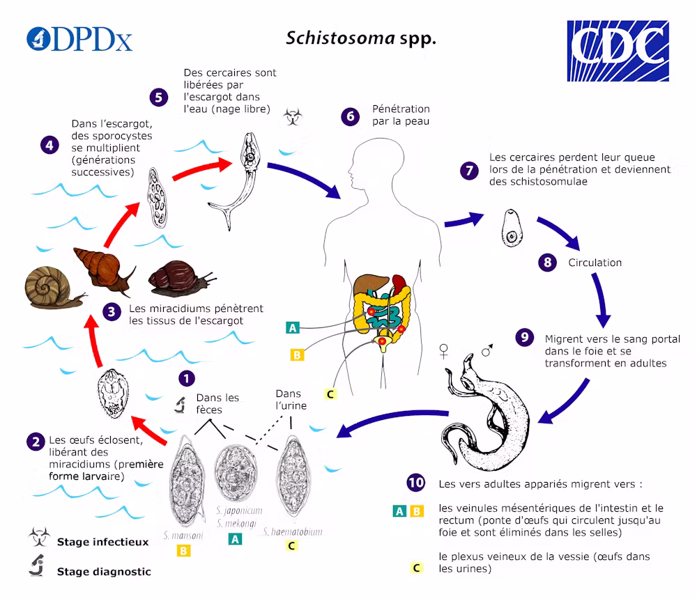 Le cycle des schistosomes, responsables de la schistosomiase ou bilharziose.