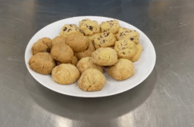 Ajouter 10 g de farine, 20g de cranberries séchées, 20g de noisettes et 10g de graines de courges à la pâte. Former un boudin avec la pâte et découper des tranches de 2cm d’épaisseur. Les cuire pendant 15 minutes à 180°C