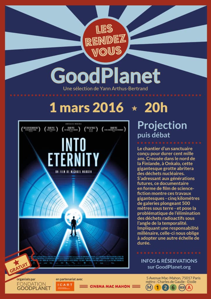 Lieu : Projection gratuite au Cinéma Mac Mahon (5 avenue Mac Mahon, Paris 17e, métro ligne 1-2-6 /RER A Charles de Gaulle Étoile sortie 6 : Avenue Carnot) avec réservation obligatoire à ce lien : https://www.eventbrite.fr/e/billets-projection-de-into-eternity-de-michael-madsen-21305015876 et dans la limite des places disponibles.