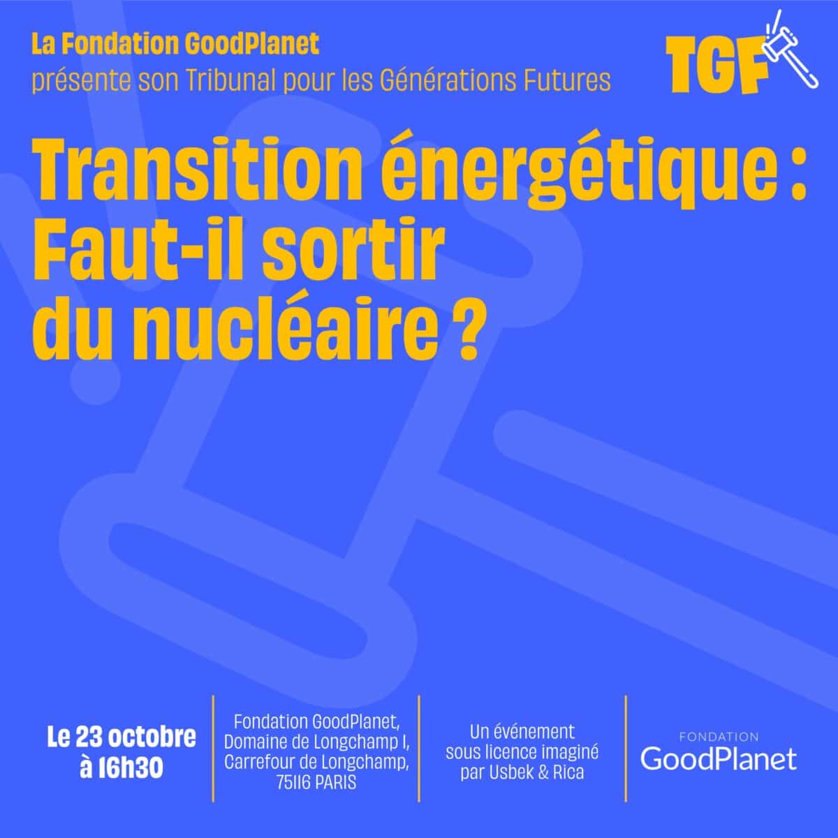 Pour en juger, la Fondation GoodPlanet se transforme exceptionnellement en un tribunal d’un nouveau genre: celui des générations futures. Nos invités de choix débattront sur cette problématique. Face à une juge, un avocat et un procureur, nous retrouverons comme témoins : Nicolas Nace, chargé de campagne nucléaire chez Greenpeace; Sandrine Rousseau, économiste, écoféministe et finaliste des dernières primaires EELV; Myrto Tripathi, présidente des Voix du Nucléaire; ainsi que Cécile Maisonneuve, conseillère auprès du centre énergie et climat de l’Institut français des relations internationales. Chacun fera entendre ses arguments pour permettre à 5 jurés tirés au sort de rendre le verdict, au nom des générations futures. Pour découvrir si le nucléaire sera finalement condamné ou acquitté, nous vous donnons rendez-vous ce samedi 23 octobre à 16h30 !