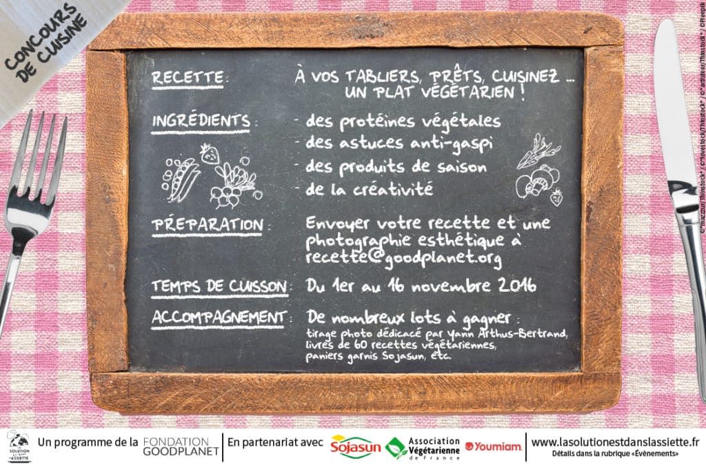 Les équipes de la Fondation GoodPlanet ont lancé le 1er novembre dernier un concours de cuisine végétarien, en partenariat avec Sojasun, l’Association Végétarienne de France (AVF) et sa campagne 1, 2, 3 Veggie, Youmiam et Valérie Cupillard.