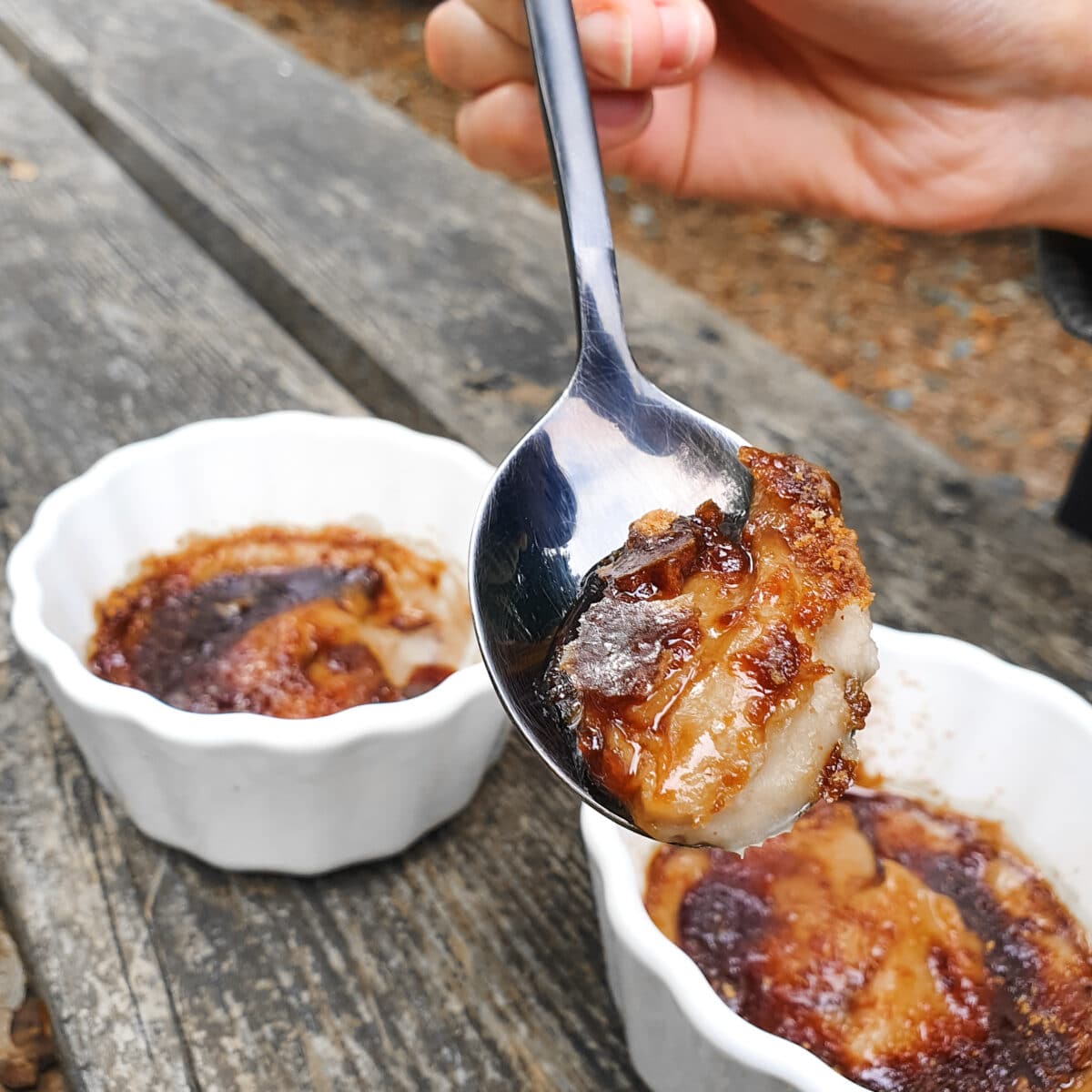 4. Verser la crème épaisse dans des ramequins à bords épais, saupoudrer de sucre muscovado et faire caraméliser sous le grill du four.