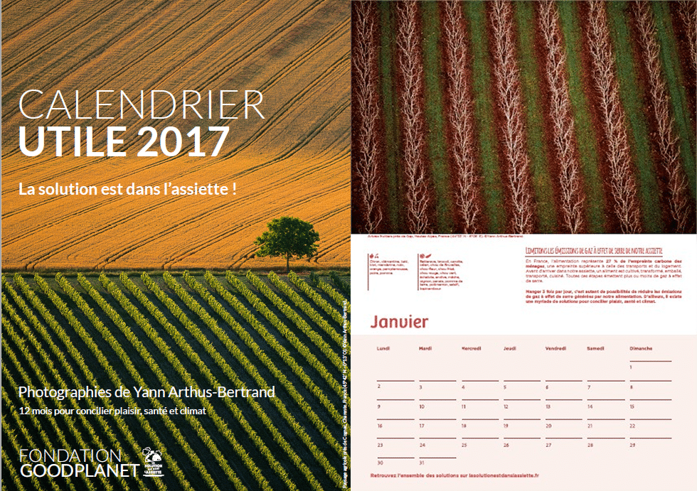 La Fondation GoodPlanet a développé un « Calendrier Utile 2017 » sur le thème de l’alimentation durable* (format A3 vertical). Vous y retrouverez des photographies de Yann Arthus-Bertrand, les fruits et légumes de saison, des chiffres clés et de nombreuses astuces pour concilier plaisir, santé et climat !