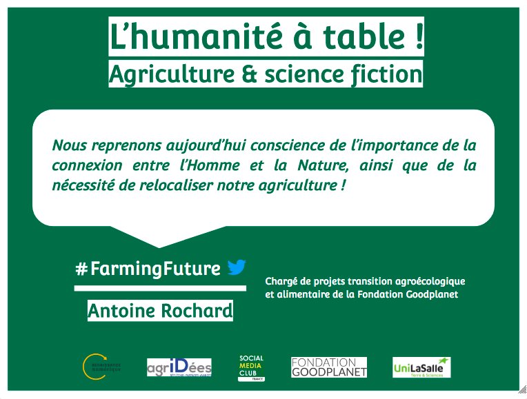 « La science-fiction nous invite à explorer ces mondes en construction, et l’extrapolation du réel faite par ses auteurs nous permet de réfléchir aux enjeux de l’agriculture et l’alimentation de demain : entre nécessité de productivité de plus en plus importante, épuisement des sols, raréfaction de l’eau douce et pression démographique, les défis à relever pour nourrir l’humanité dans les 50 ans à venir s’annoncent de taille. Mais l’innovation et les nouvelles technologies (biologiques ou numériques) prennent aujourd’hui une place majeure dans la diversité des solutions que les acteurs (traditionnels ou non) du secteur sont en train d’inventer ensemble.