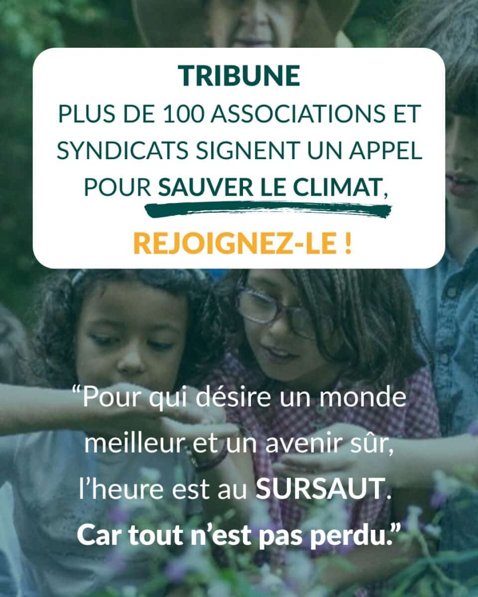Plus de 100 associations lancent un appel dans la presse Nous avons besoin de vous pour sauver le climat . Face aux attaques incessantes contre nos droits et contre la planète, l’heure doit être au sursaut et non au désespoir. Car tout n’est pas perdu. 10 ans après l’accord de Paris, la France peut et doit faire plus et mieux. C’est une question de survie et de justice ! Ensemble, battons-nous pour le climat.