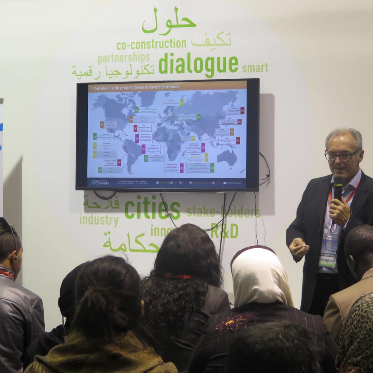 Les 10 et 11 novembre, la Fondation a réalisé plusieurs conférences dans l’Agora des Solutions de son partenaire Suez. Quatre programmes correspondant aux thèmes principaux de la COP22 – Adaptation, Afrique, Alimentation – ont remporté un vif succès : Compensation Carbone Volontaire, La Solution est dans l’assiette, Africompost et Écoles Bioclimatiques.