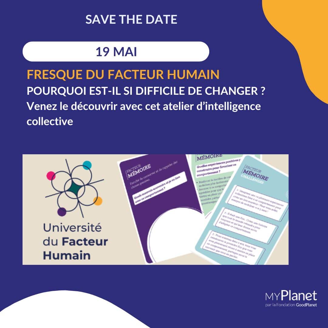 La Fondation GoodPlanet accueille la Fresque du Facteur Humain le lundi 19 mai de 16h à 19h. Il s’agit d’une expérience d’intelligence collective qui aide à mieux comprendre ces mécanismes pour lever les freins au changement et renforcer notre capacité d’agir. Pour y participer, s’inscrire sur HelloAsso. Inscription gratuite dans la limite des places disponibles.