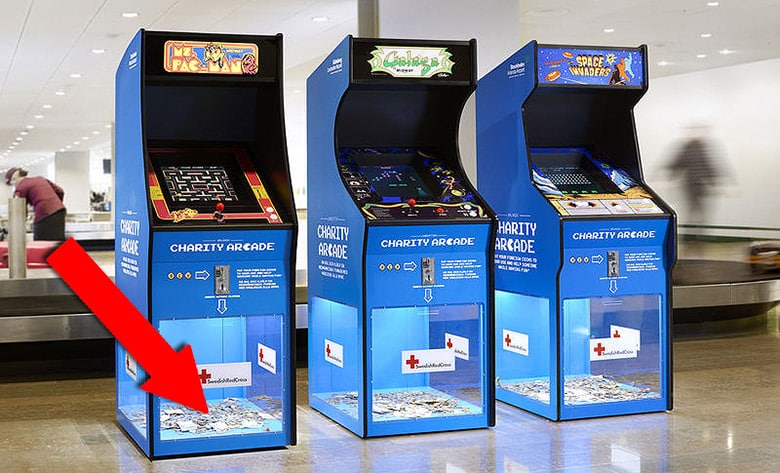 La Croix Rouge Suédoise a fait installer par-dessus ses urnes des bornes d’arcade vintages. Pac-Man, Galaga ou encore Space Invaders, ces jeux acceptent toute devise et tout montant contre une partie de jeu-vidéo, vous débarrassant de vos monnaies étrangères. Les gains récoltés sont ensuite entièrement reversés à l’ONG.