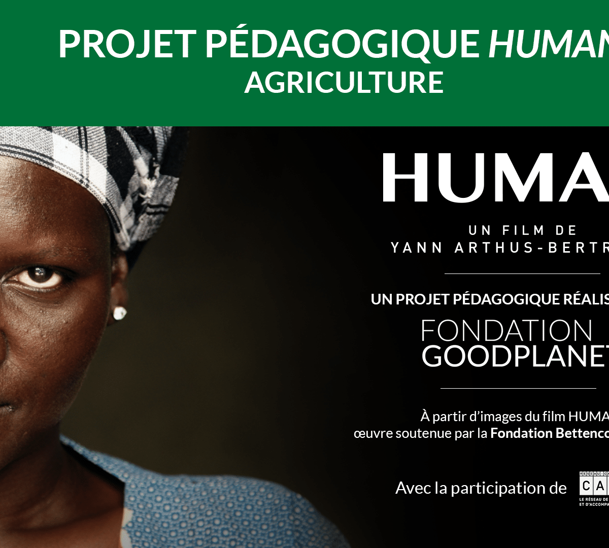 HUMAN Agriculture réalisé par la Fondation GoodPlanet à partir d’images du film HUMAN, œuvre soutenue par la Fondation Bettencourt Schueller, a été lancé le 1er février 2018 lors de l’événement FOREDD* organisé par le Ministère de l’Education Nationale. Le Projet Pédagogique HUMAN Agriculture expose la mosaïque planétaire des agricultures et le renouvellement des pratiques des paysans face aux bouleversements des habitudes alimentaires. Il se compose de 5 vidéos et d’un support éditorial ayant pour objectif de s’intégrer dans le programme scolaire des élèves.