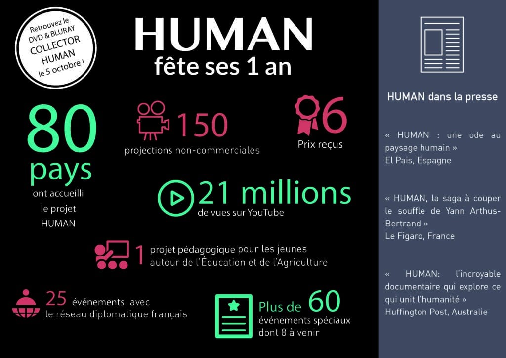 Un an après la première mondiale, organisée aux Nations Unies à New York et à la Mostra de Venise, le 12 septembre 2015, HUMAN continue d’être projeté sur de nombreux écrans par le biais de cinémas, festivals, ONGs, ambassades, alliances françaises, écoles, prisons, hôpitaux en France & à l’international…
