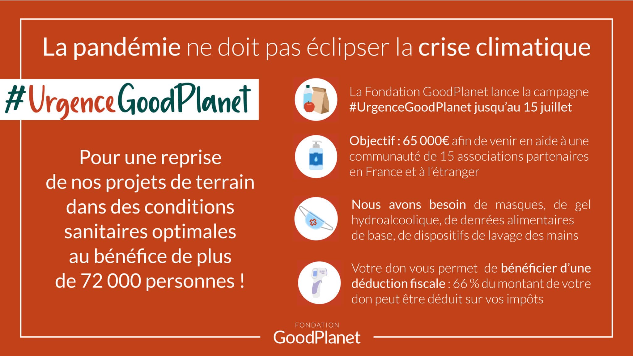 La campagne de levée de fond continue afin de venir en aide à une communauté de 15 associations partenaires partout dans le monde. Soyons solidaires avec ces hommes et femmes qui risquent leurs vies pour construire un monde plus durable et venir en aide aux populations les plus démunies