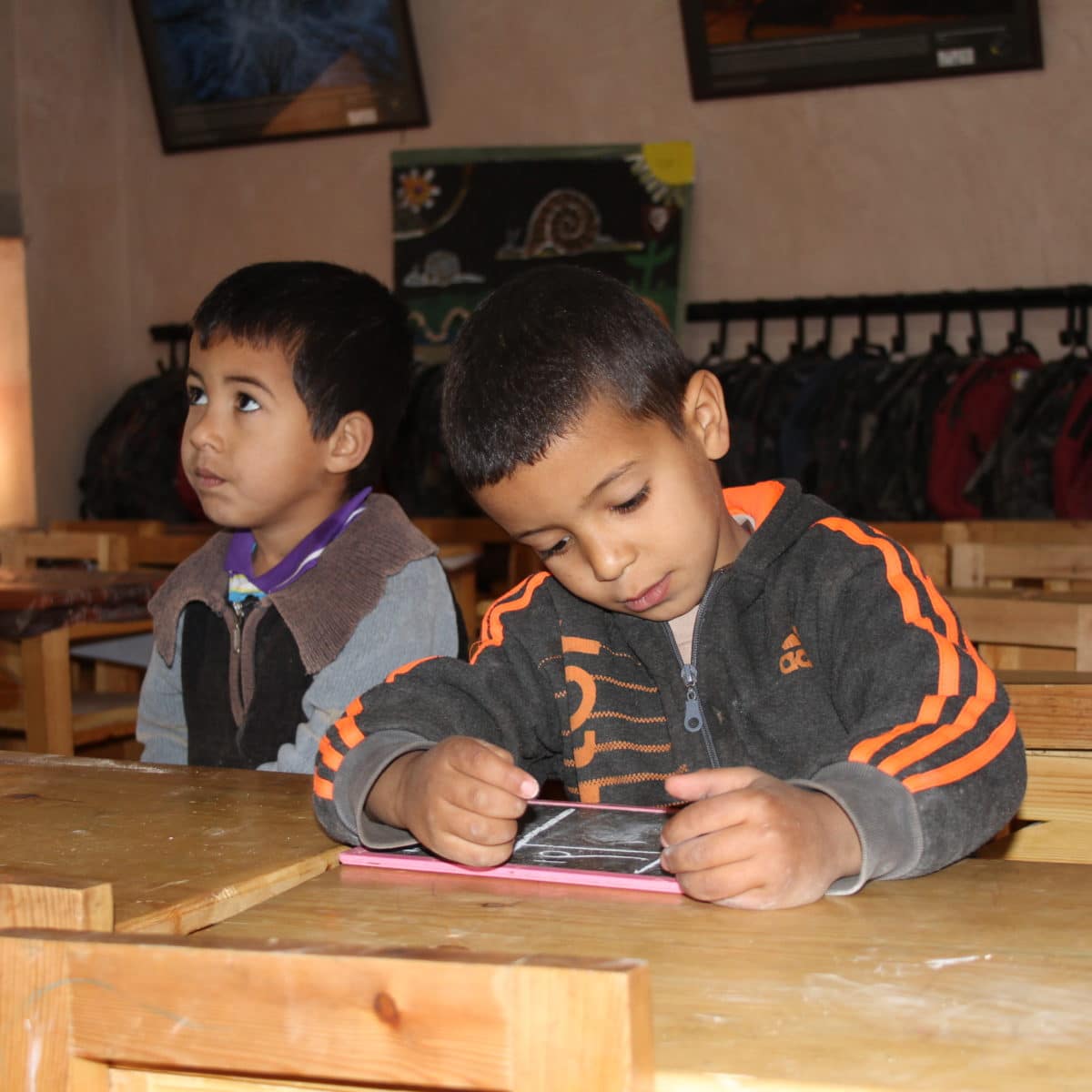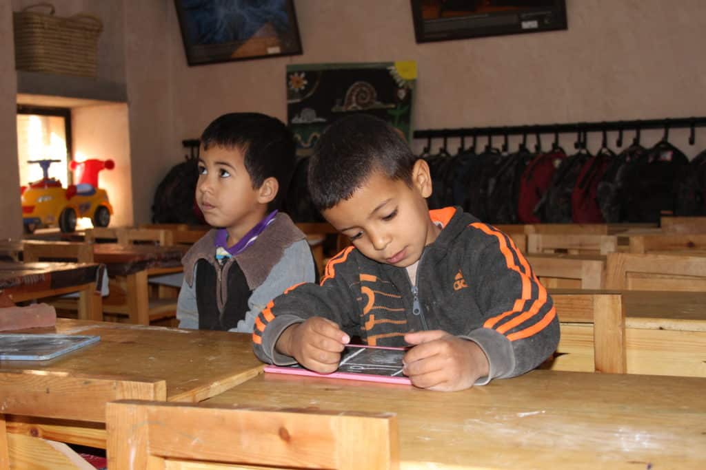 Et que de nouveautés : à la maison, on parle le tachelhit (langue berbère) ou le darija (arabe dialectal marocain), mais à l’école, on découvre le français et l’arabe littéraire et on apprend à tracer les lettres dans 3 alphabets différents !