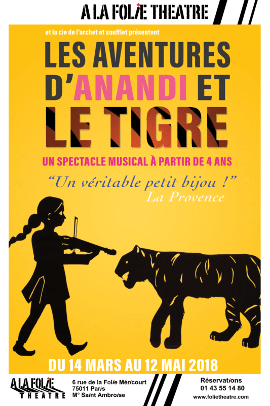 On partage avec vous ce spectacle musical pour enfants, « Les aventures d’Anandi et le tigre », joué du 14 mars au 12 mai 2018 à La Folie Théâtre (11ème, Paris).