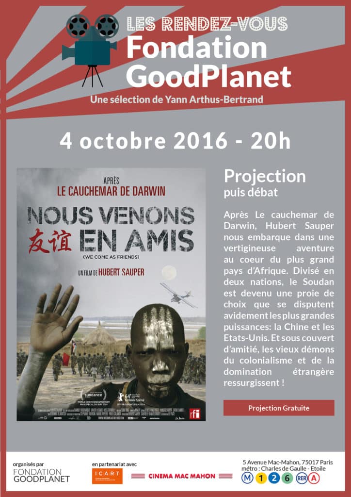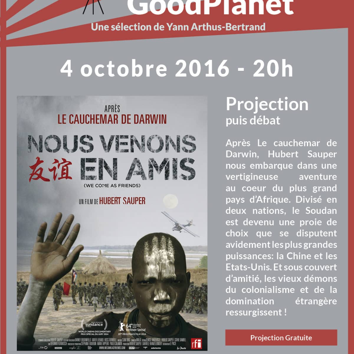 Les équipes de GoodPlanet vous convient à la projection gratuite du film Nous venons en amis de Hubert Sauper, le mardi 4 octobre (à 20h) en présence de notre président Yann Arthus-Bertrand.