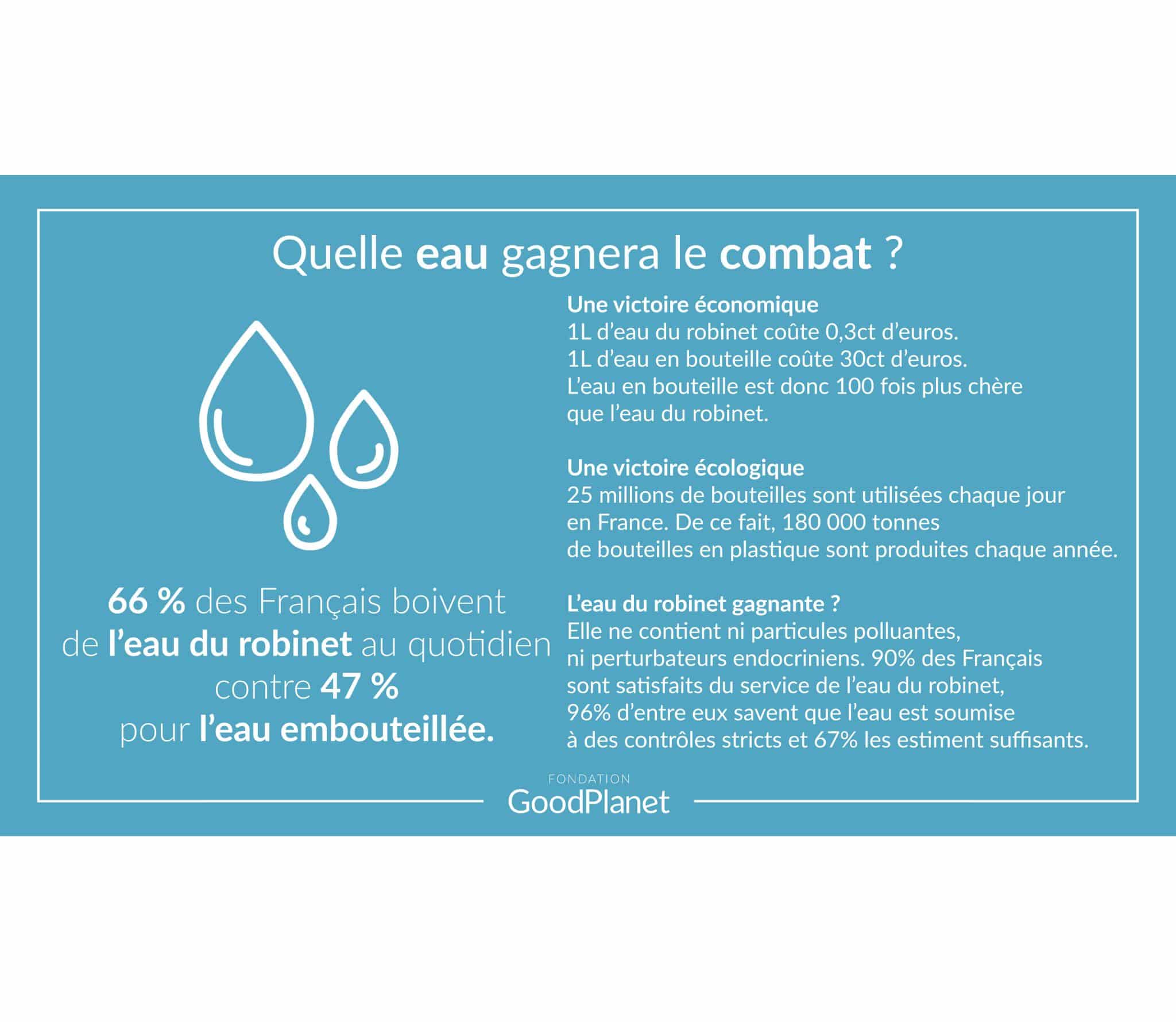 D’un côté une eau d’origines diverses (eau de surface, eau souterraine, fleuves, eaux usées, etc.) qui est potabilisée par traitement chimique et ajout de chlore et dont la destination principale n’est pas l’hydratation mais essentiellement répondre aux besoins en eau du quotidien (WC, douche, lessive, etc.) et de l’autre une eau naturellement pure, uniquement destinée à l’hydratation, qui doit obligatoirement être embouteillée à la source et ne peut faire l’objet d’aucun traitement (obligation légale). Alors oui, l’emballage est source d’émissions CO2, mais en même temps, vu le cadre juridique,… Et au niveau économique, l’eau du robinet est moins chère, mais on parle d’un service public subventionné!! Enfin, ce qui est bon pour la planète ne l’est pas nécessairement pour la santé. Une eau du robinet traitée chimiquement, contenant du chlore et déconseillée pour les nourrissons et certains publics fragiles, sans parler du fait que l’eau du robinet est en effet contrôlée sur un certain nombre de paramètres vieux de 40 ans, sans l’être sur d’autres, qui peuvent s’avérer problématiques.