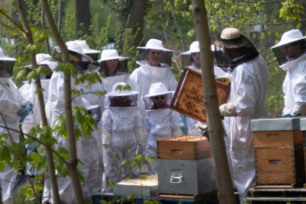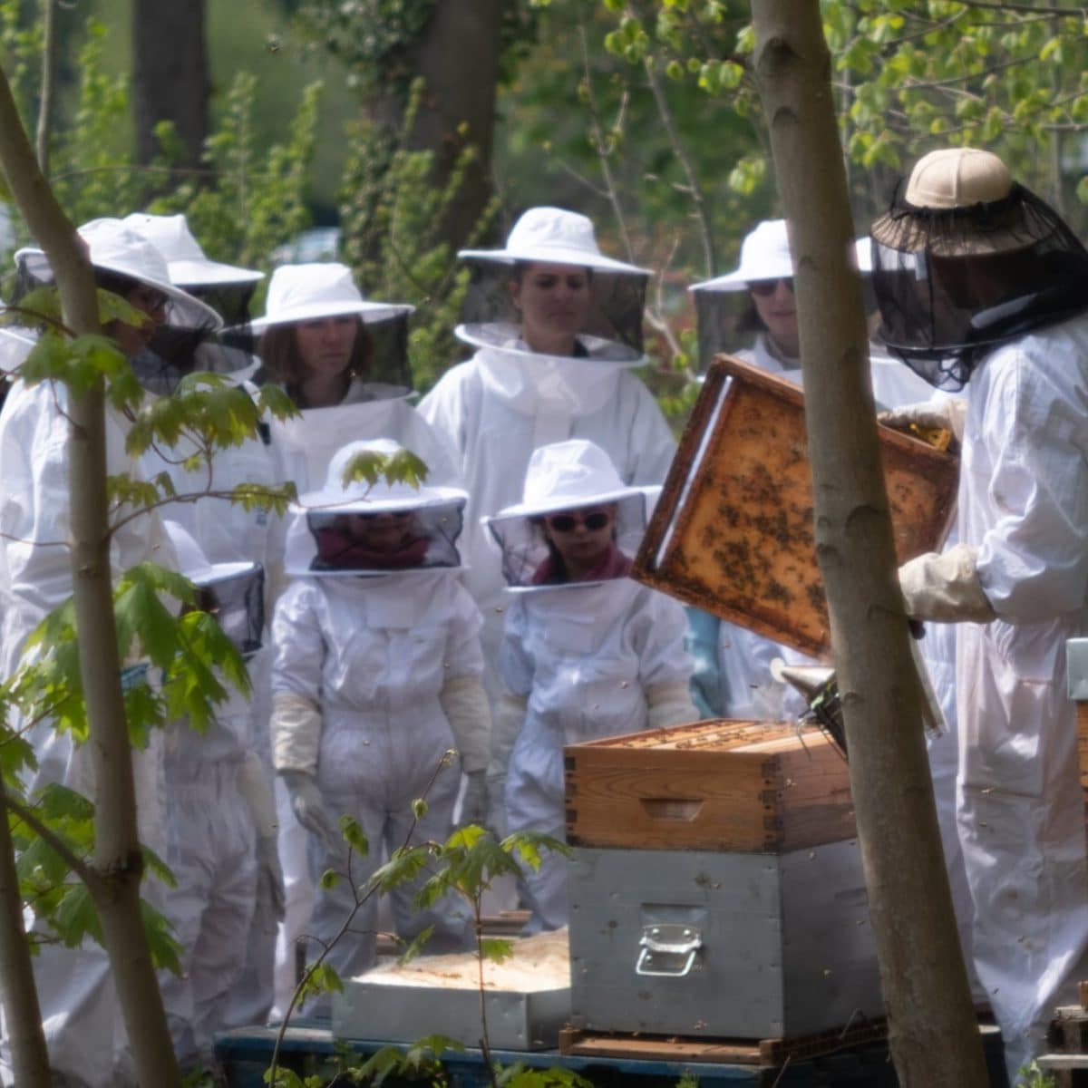 Vous enfilerez ensuite vos tenues pour ouvrir les ruches afin de contempler de plus près l’étonnante organisation des abeilles.