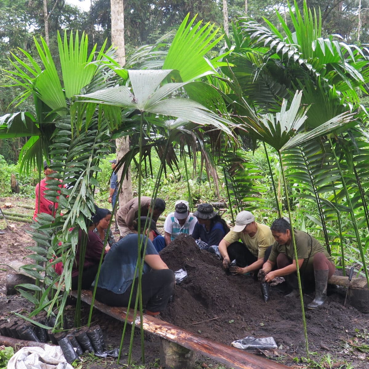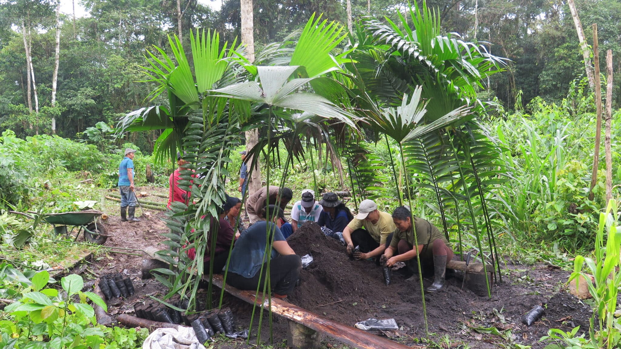« Ploc, ploc ! », c’est le doux bruit des gouttes d’eau qui frappent notre abri de fortune en palmes. La pluie n’est jamais bien loin dans cette région équatorienne de Tena, en plein cœur de l’Amazonie. Aujourd’hui est un jour de « minga » (travail collectif) à Mulchi Yaku. Les habitants ont fait appel à l’association Ishpingo pour installer une pépinière communautaire pour reboiser les parcelles des participants. Les uns s’activent à la machette pour débroussailler, d’autres mélangent la terre au bokashi (fertilisant biologique préparé par l’association) que l’on tassera ensuite dans les sachets qui accueilleront les jeunes plantules. Plus loin, un petit groupe met en place les poteaux qui soutiendront l’ombrière pour les jeunes plants. Sur le feu, la marmite bout pour le déjeuner qui clôturera l’installation de la pépinière. Ambiance humide et conviviale…