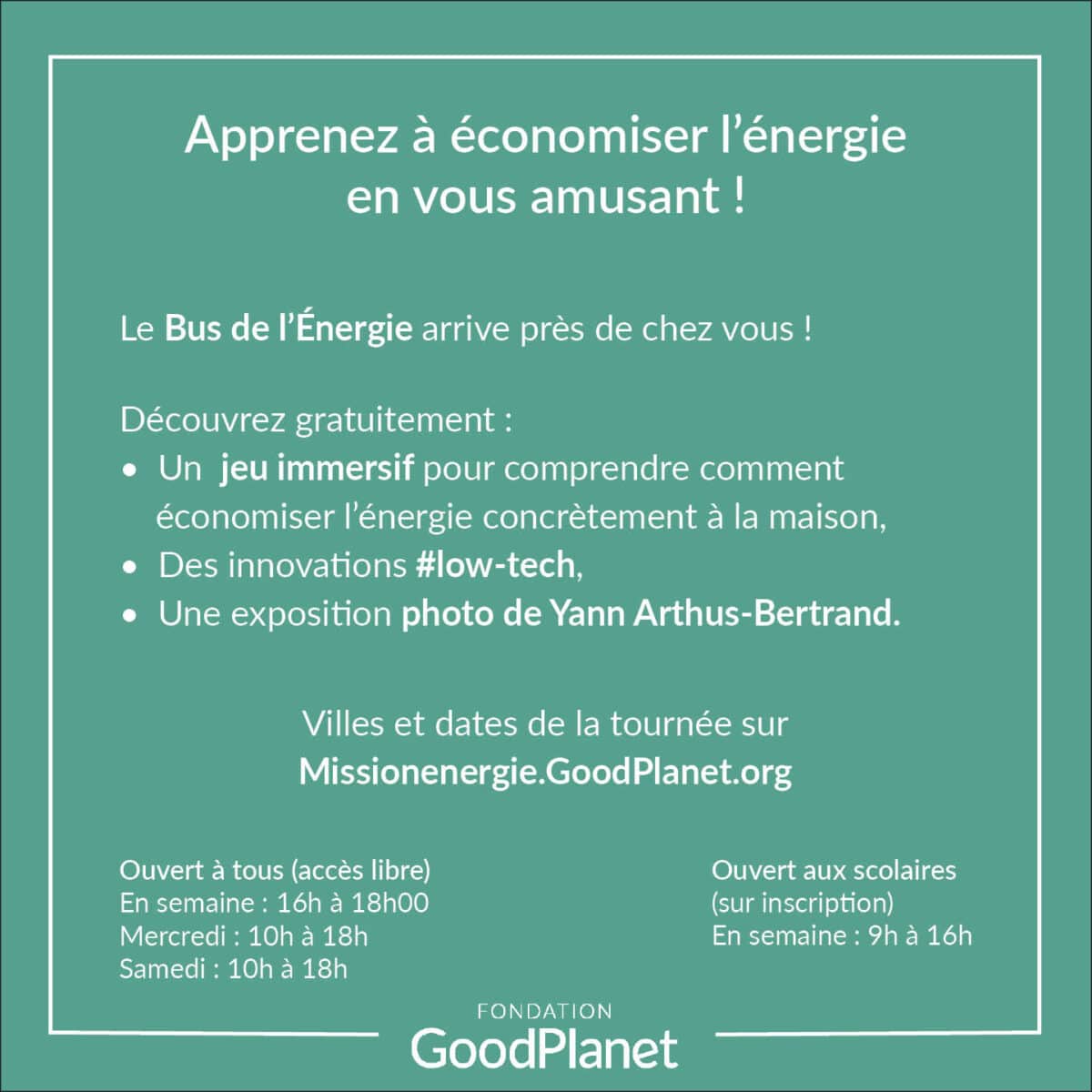 Le Bus de l’Énergie repart en tournée ! ⚡️A son bord, un jeu immersif, des innovations low-tech et une exposition photo de Yann Arthus-Bertrand pour apprendre pourquoi et comment économiser l’énergie.