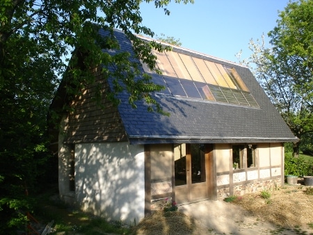 Economie : La maison est conçue comme un seul capteur solaire. Le soleil, à travers les vitres, chauffe les B.T.C. (Briques de Terre Compactées) qui accumulent les calories . La paille très isolante, à l’extérieur, prévient du froid; les murs et le plancher rayonnent donc à l’intérieur en chauffant la maison.