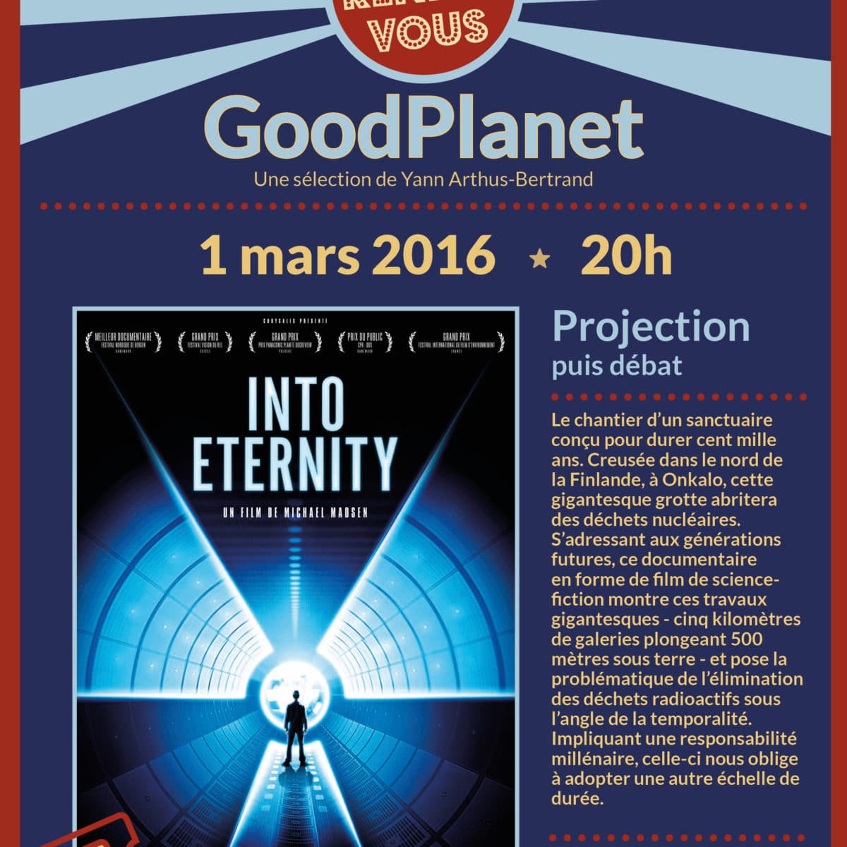 Une fois par mois la Fondation GoodPlanet propose une projection suivie d’un débat au cinéma le Mac Mahon, à Paris. En mars, la fondation a mis à l’honneur le film Into Eternity, du réalisateur danois Michael Madsen. La fondation avait alors reçu à cette occasion Patrick Charton de l’Agence nationale pour la gestion des déchets radioactifs (Andra) et Isabelle Jouette de la Societé Française de l’énergie Nucléaire (SFEN). Into Eternity est un documentaire qui nous plonge avec passion, et parfois effroi, au cœur d’un défi majeur auquel notre société énergivore doit faire face : que faire des 250 000 tonnes de déchets radioactifs présents sur terre ?