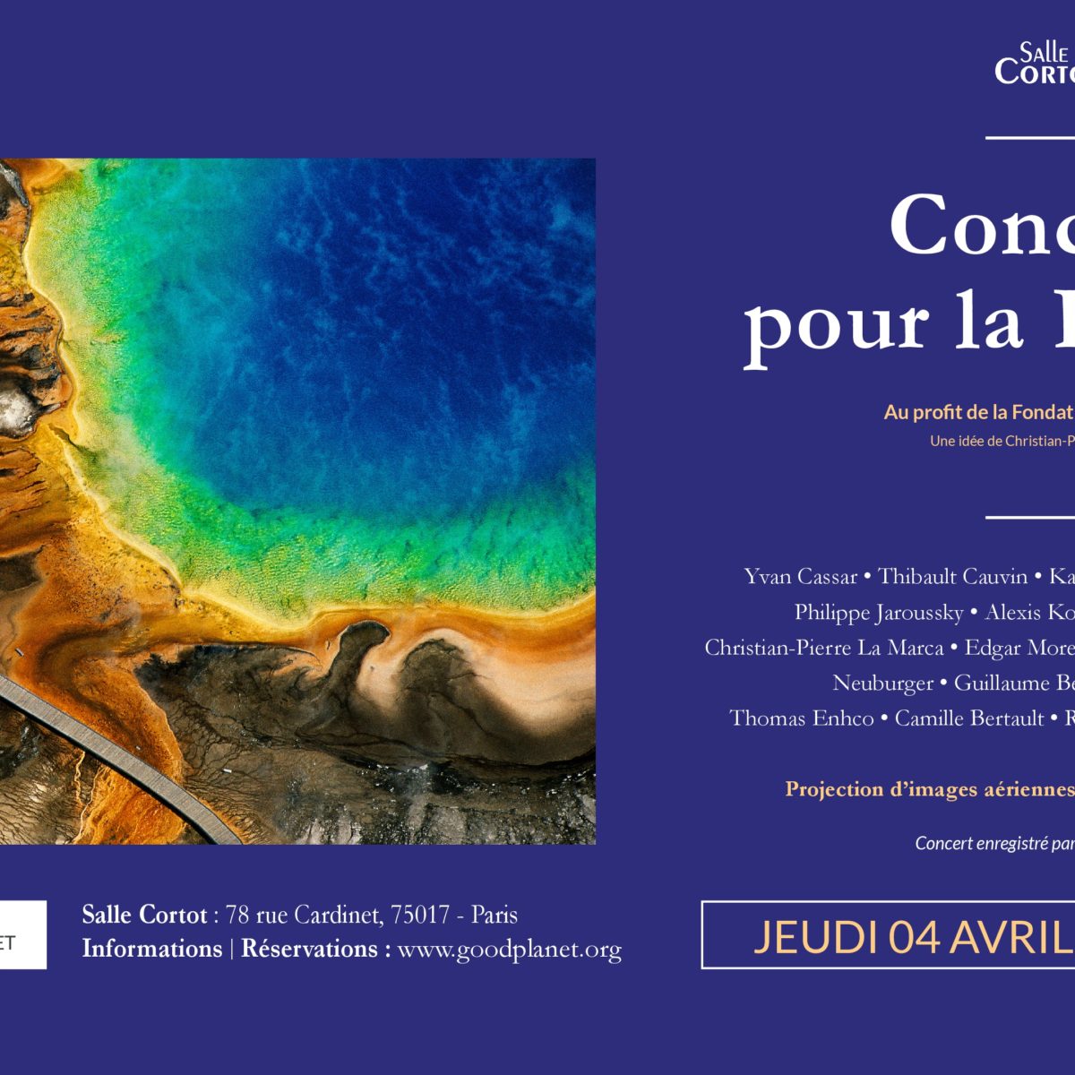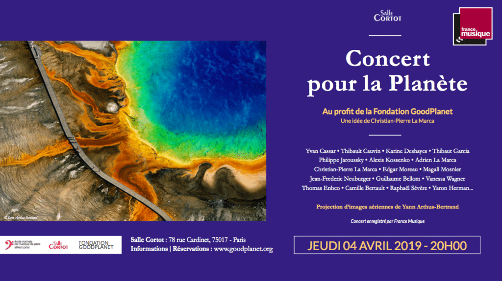 Le Jeudi 4 avril 2019, à l’initiative du violoncelliste Christian-Pierre La Marca, un concert exceptionnel de musique classique sublimé par la projection d’images aériennes de Yann Arthus-Bertrand se déroulera à la Salle Cortot, à Paris.