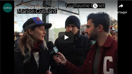 ? Merci pour leur intervention : Marion Cotillard FR, Guillaume Canet, Anna Ched de NACH, Damien Kalune, Romaric Thurel de Youth for Climate France, Fabienne Woelfflin de L214 Ethique et Animaux, Pauline Boyer d’ Alternatiba et de ANV Action non-violente COP21