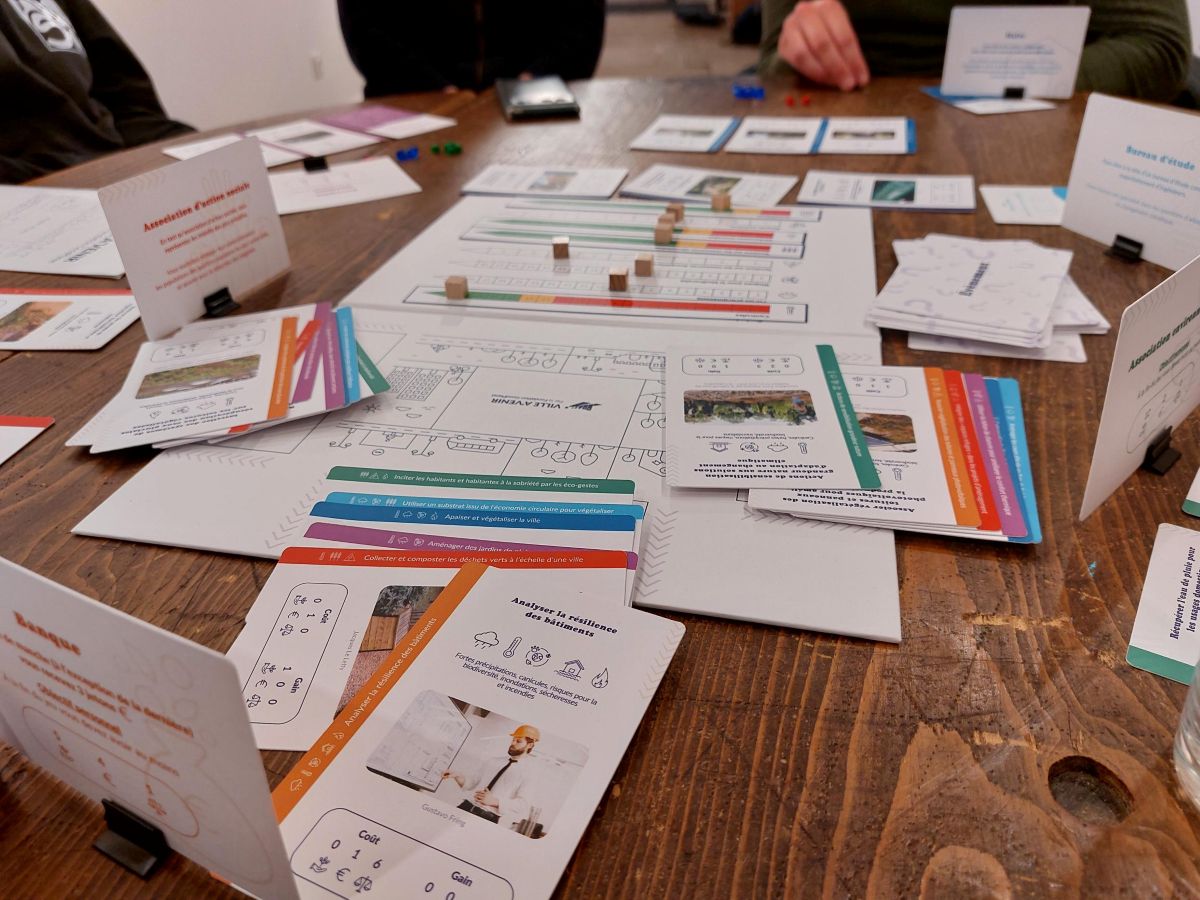 La dernière étape de l’atelier est constituée du jeu à proprement parlé, qui donne une touche ludique à l’ensemble. Le but du jeu est simple : coopérer pour mettre en place des actions d’adaptations et avoir une ville résiliente en 2050. Anna Blouet, cheffe de projet AdaptaVille à l’Agence Parisienne du Climat, a participé à un atelier de co-création autour du jeu Ville A’venir. Ce serious game s’appuie sur des contenus pédagogiques inspirés des solutions AdaptaVille, un dispositif gratuit d’accompagnement des professionnels sur l’adaptation au changement climatique. Vous connaissez les noues urbaines ? Le béton de chanvre ? Ville A’venir permet de découvrir ces solutions concrètes d’adaptation, d’en évaluer les points forts, les contraintes et de les replacer dans des contextes d’application réelle, à partir d’exemples issus d’AdaptaVille. Anna Blouet trouve que ce jeu est « parfait pour des entreprises qui ne connaissent pas la thématique climatique. L’approche ludique semble susciter un fort engagement. » La spécialiste de l’adaptation résume ainsi son expérience de cocréation : « un format ludique avec les pions, la monnaie, une matérialisation comme celle-là, s’avère intéressant. Disposer d’un jeu autour des solutions permet de motiver le passage à l’action. » Pour elle, ce jeu est un premier niveau de sensibilisation qui a surtout l’avantage de mettre l’accent sur la coopération.