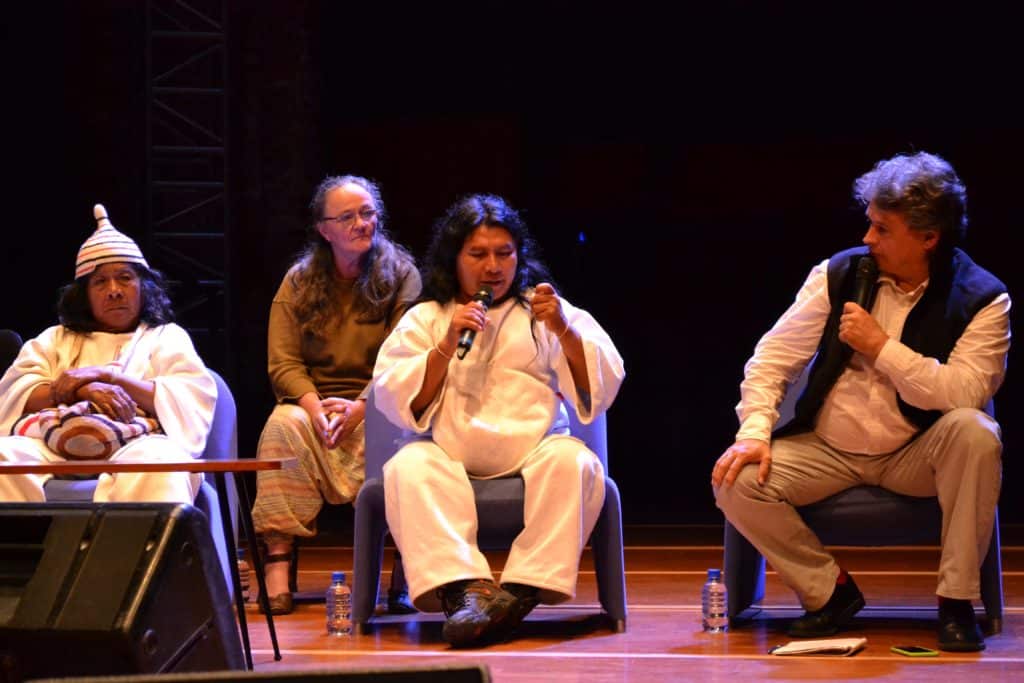 Trois hommes Kogis ont fait le voyage, dont deux mamus : des chamans qui guident leur communauté. « Mamu signifie soleil, et le soleil c’est celui qui guide, qui éclaire, qui protège et aide tout le monde. Le mamu est en lien avec la nature. », explique le troisième kogi, un jeune étudiant en comptabilité. Lui, vit entre les deux mondes, celui de ses ancêtres et celui du XXIème siècle. Il parle très bien espagnol, et appréhende mieux la culture des petits frères, il fait le lien entre son peuple et la modernité.